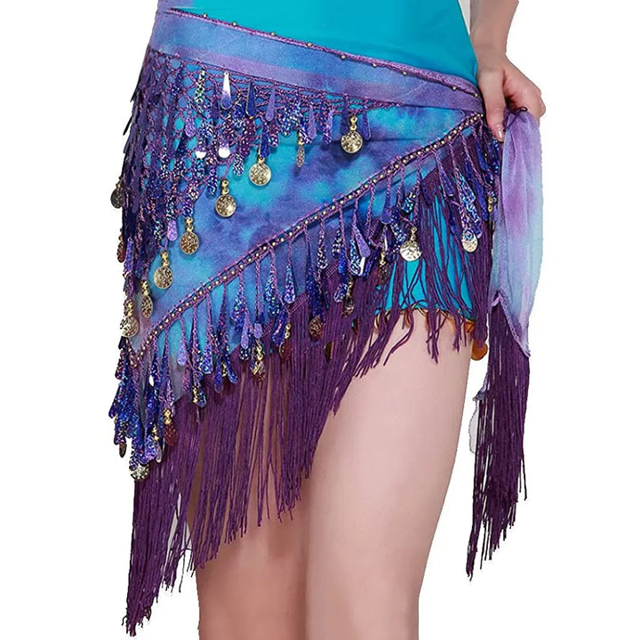 This colorful tie-dye hip scarf is decorated with teardrop paillettes, gold beads, gold coins and 15cm fringe. Use for any style of belly dance, from Tribal to Gypsy to Cabaret. Also great for Halloween costuming. Made of nylon shimmer chiffon, faux silk fringe, and hologram paillettes with gold metallic beads and faux coins.
