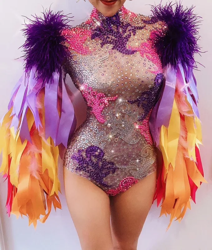 Colourful Feather Sleeve Rhinestone Bodysuit Women Nightclub Bar Party Outfit Performance Dance Costume