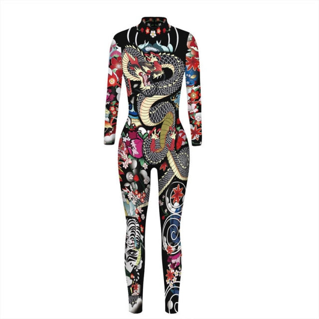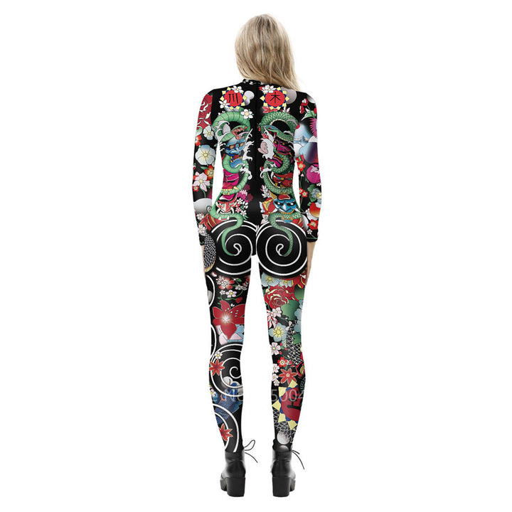 Japanischer Schädel Halloween Cosplay Kostüm Frauen Männer Overall Unterwelt Tattoo Ethnisches Drachenskelett Totem Geisha Zentai Outfits