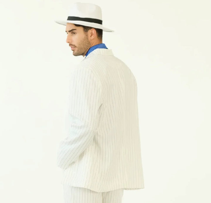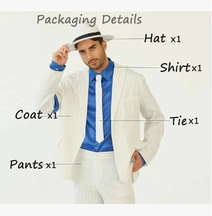 White classic smooth critical suit, products include: white stripe suit coat, white stripe pants, blue shirt, white tie, white hat