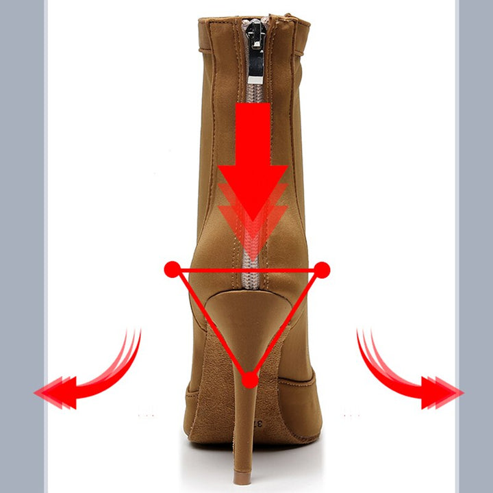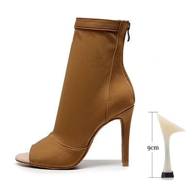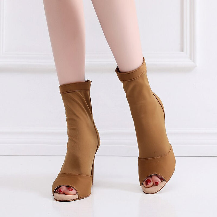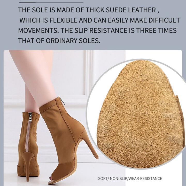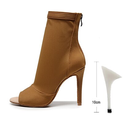 Woman Brown Latin Zip Up Dance Booties Women High Heel Stiletto Sock Bootie for Ladies Open Toe Heels Dance for Girls Pratice