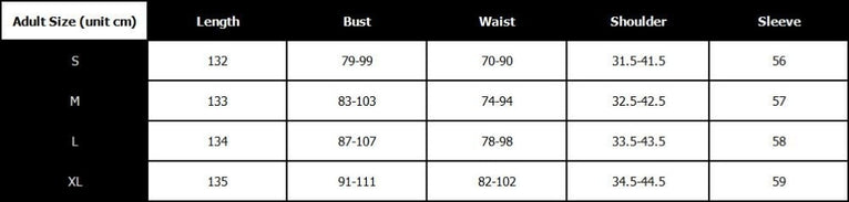 As all of our costume is hand-sewn, the finished costume may vary by approximately one (1-2) inch in either direction of the specified measurements.
