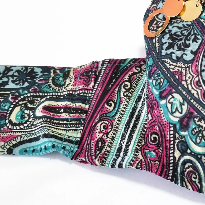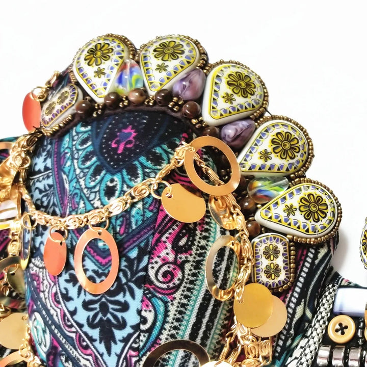 This coins tribal bra is constructed on a decorative pattern base, and features ornate knit panels, coin accents, and metal coins drapes. A beautiful start to any Tribal / ATS or folkloric costume. Bra is built onto lightly padded, shaped, wired bra cups with cotton fabric back and halter straps. Features tie straps back for added support and comfort.