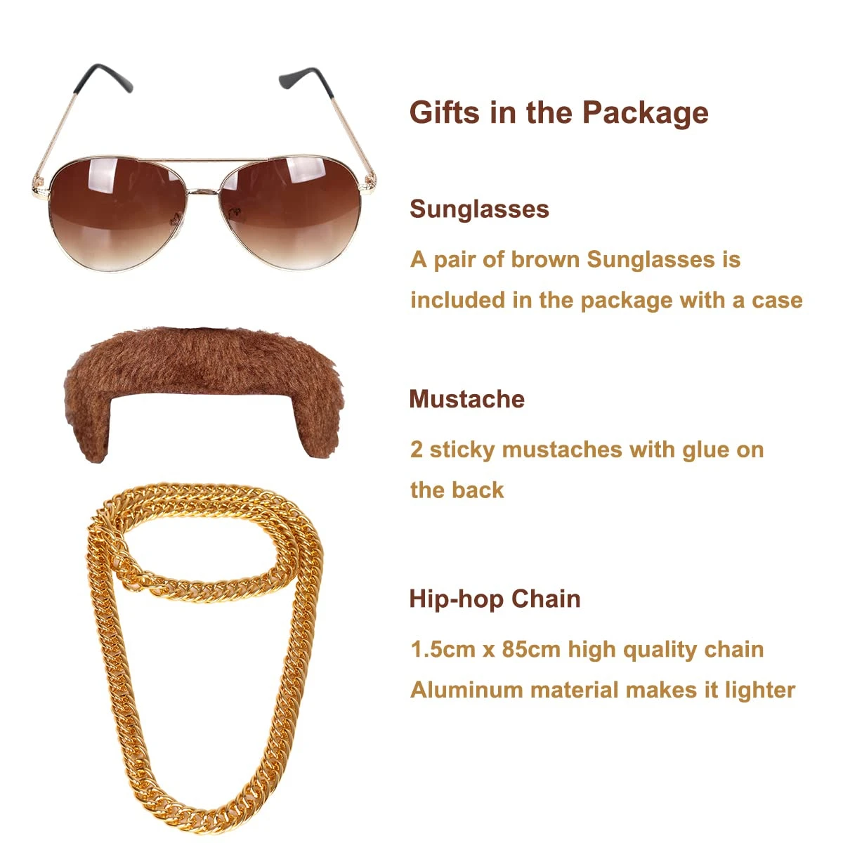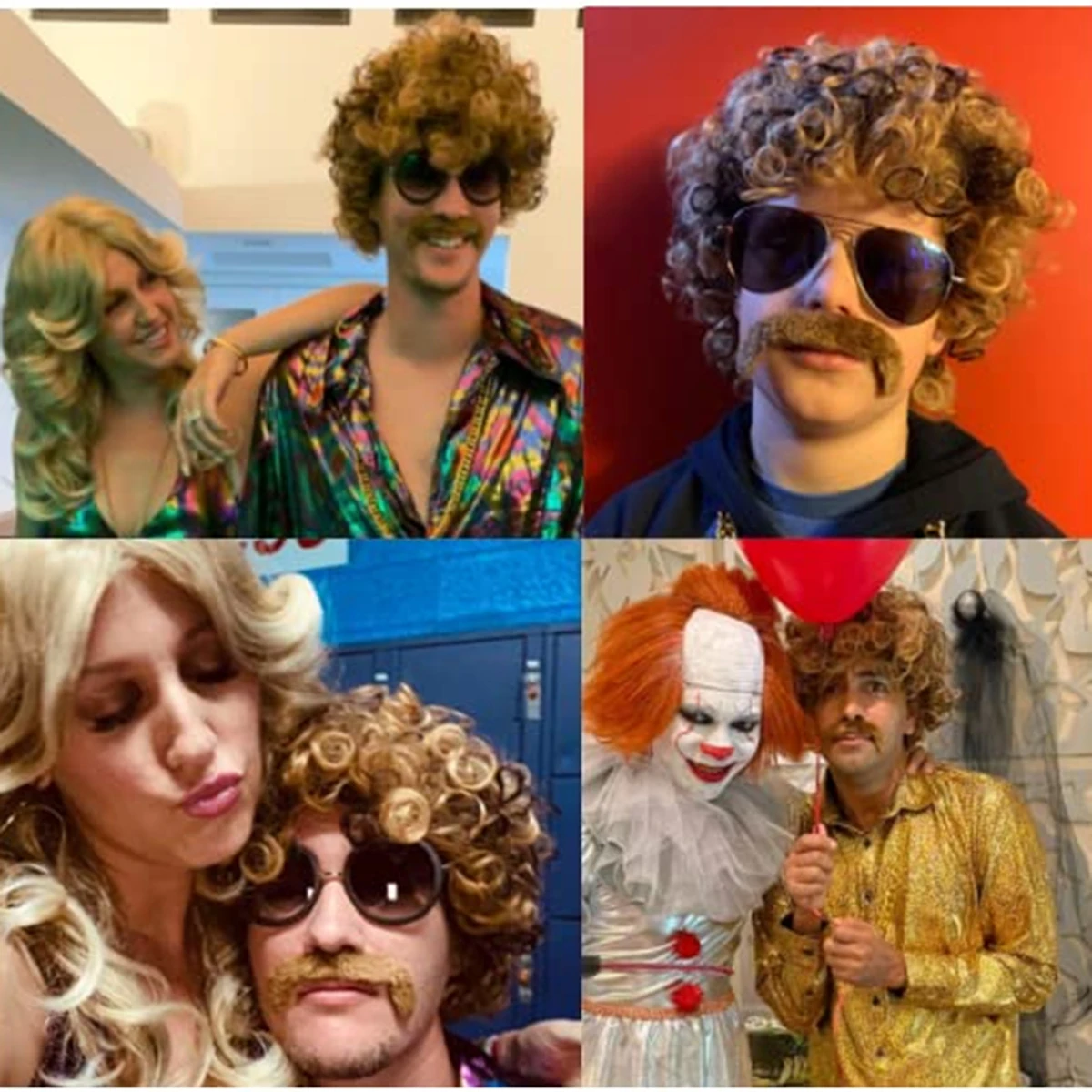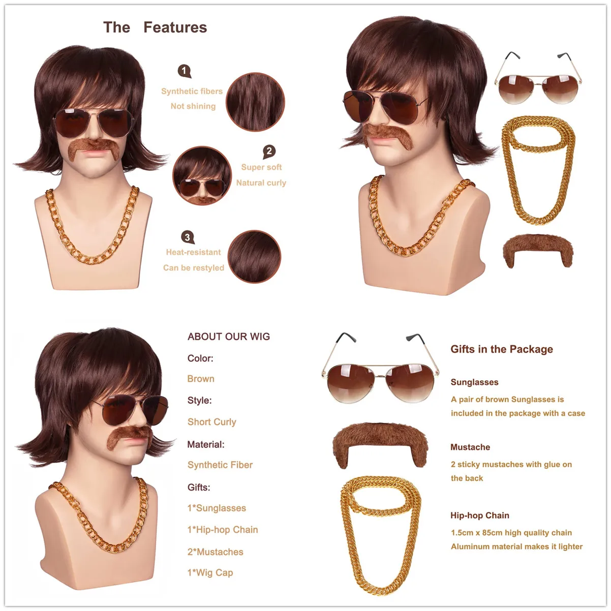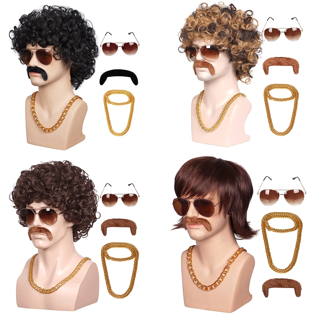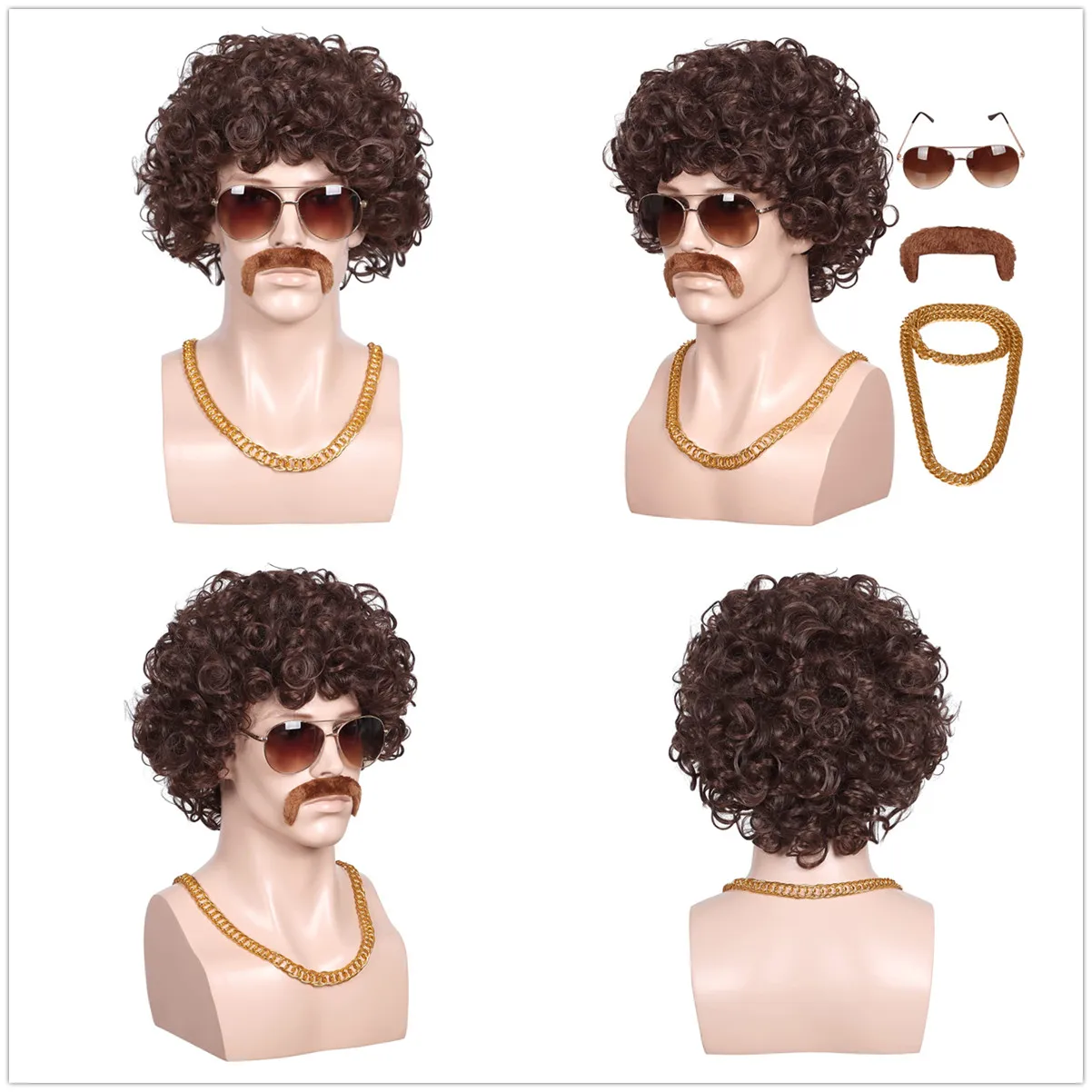 70'S Disco Party Halloween Costumes Rocking Cosplay Wig Short Curly Synthetic Hair Wigs with Moustache Glasses Necklace
