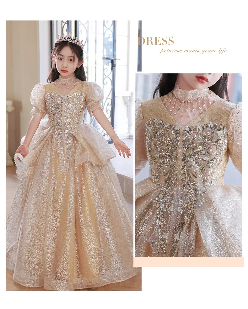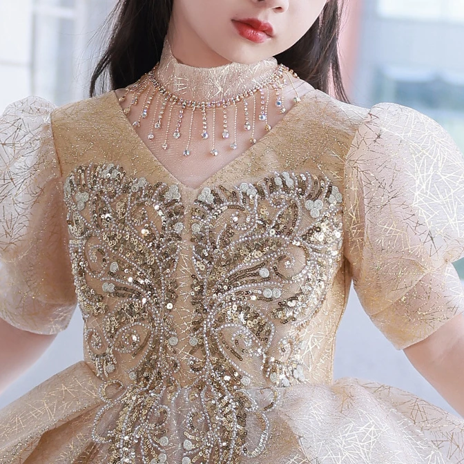 Luxury Shinny Beading Design Flower Girl Dresses for Weddings O-neck Stand Collar Girls Birthday Dress 2024 Tiered Princess Robe