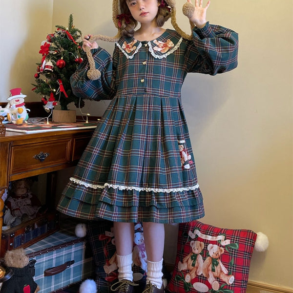 Japanese Kawaii Christmas Lolita Dress Women Sweet Peter Pan Collar Lace Plaid Princess Dresses Girl High Waist Slim Party Dress