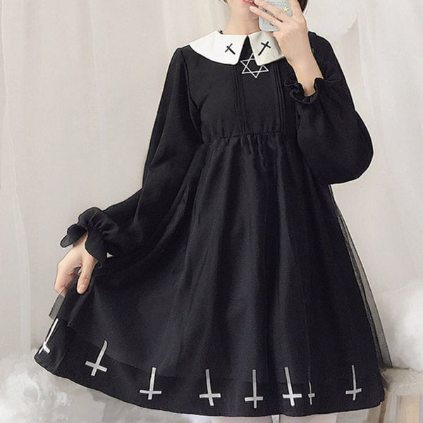 Gothic Style Dress Women Harajuku Gothic Lolita Kawaii Dress Punk Cute Long Sleeve Black Midi Dress Emo Mall Goth
