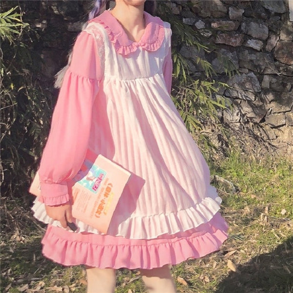 Japanese Sweet Pink Lolita Op Dress Gothic Soft Girl Cute Vintage Ruffle Maid Cosplay Black Dress Women Kawaii Two-Piece Dresses