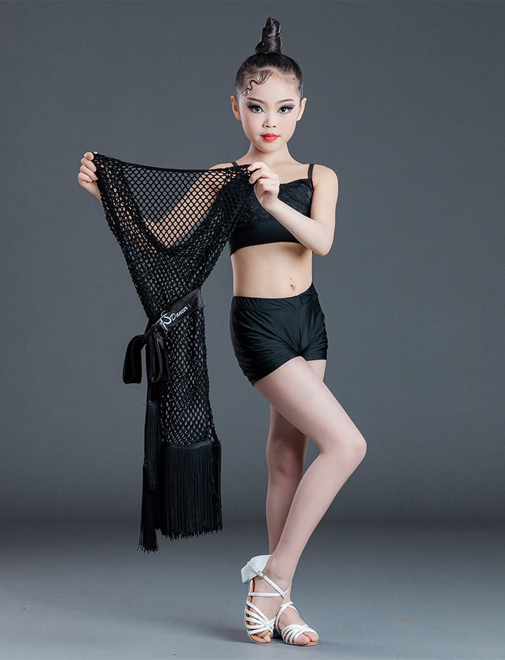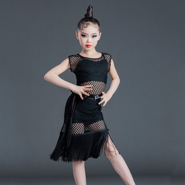 2021 Children'S Day Latin Dance Dress For Girls Black Mesh Practice Clothes Chacha Samba Tango Latin Performance Costumes SL4855