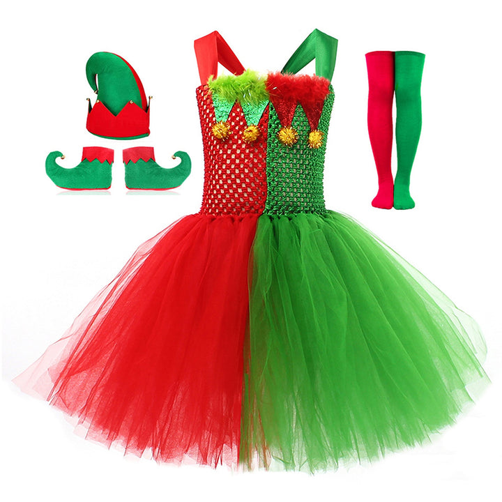 Christmas Elff Clothing Kids Girls Cutout Tutu Dress Hat Shoes Stockings Suit for Halloween Xmas Masquerade Party Cosplay Costume