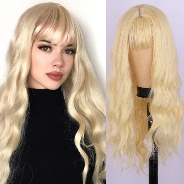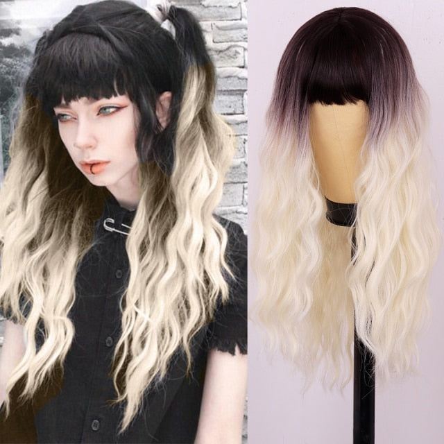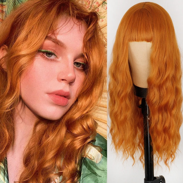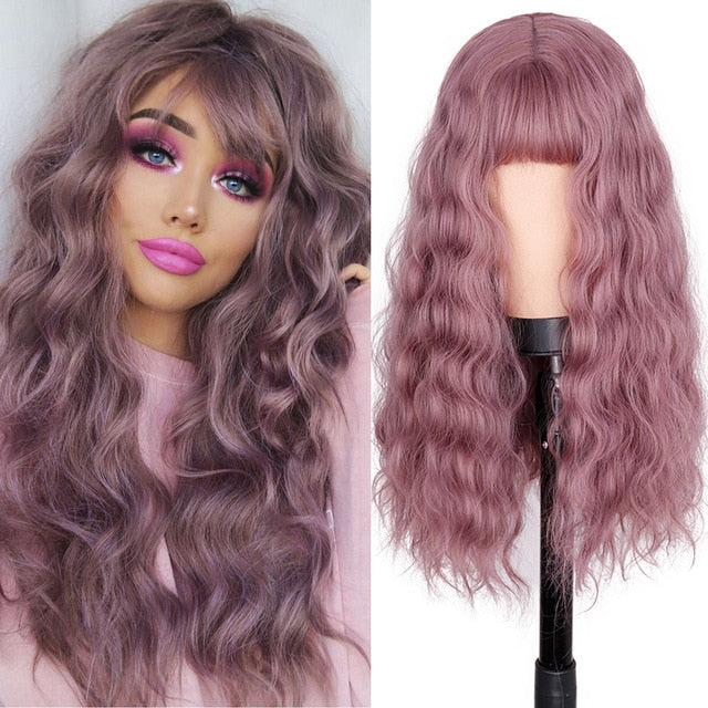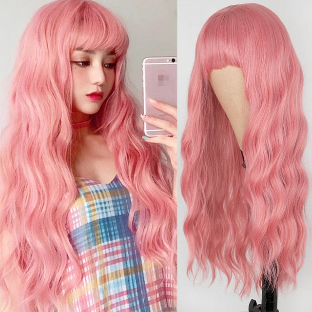 Long Mix Pink Womens Wigs With Bangs Heat Resistant Synthetic Kinky Curly Orange Gold Wigs for Women African American
