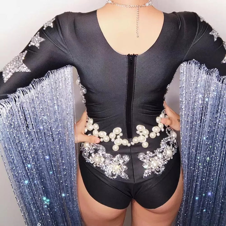 Star pattern Female Costume Crystals Fringe Sleeve Bodysuit Singer Dancer Nightclub Stage Party Bar Performance Tassel Bodysuit