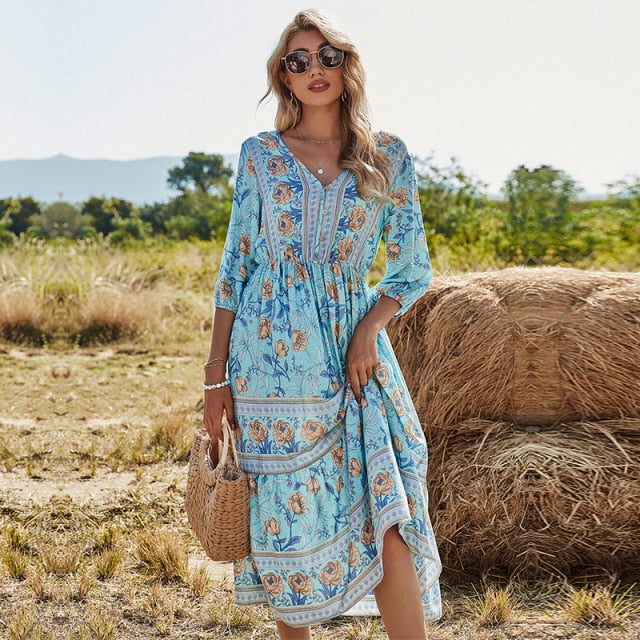 Spring New Bohemia Floral Dress Women Casual V Neck High Waist Half Sleeve Dress For Women Fashion Print Summer Dress