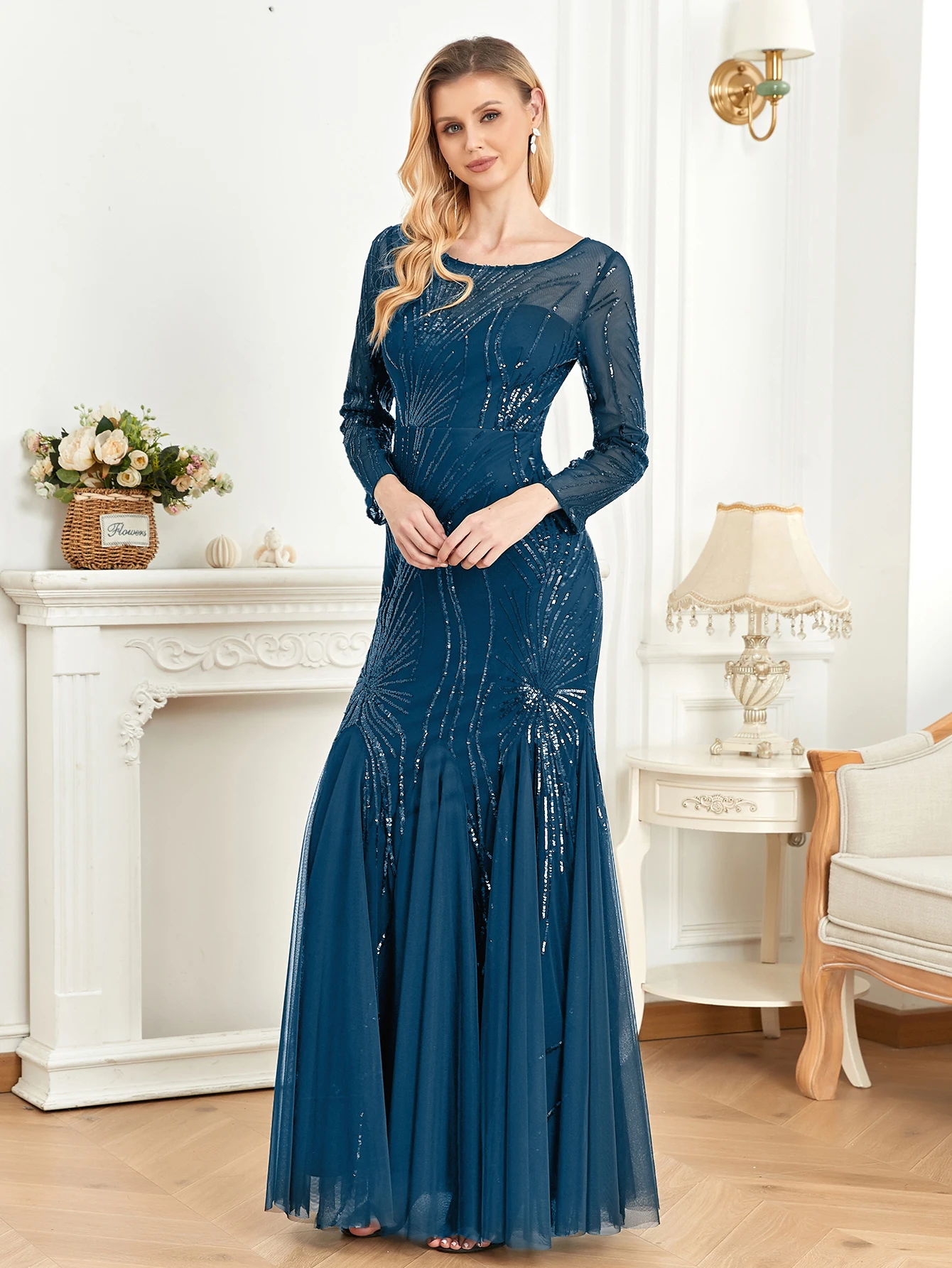 Plus Size Elegant Long Sleeves Sequin Evening Dresses For Women Mermaid Formal Bridesmaid Party Maxi Prom Dress Gown