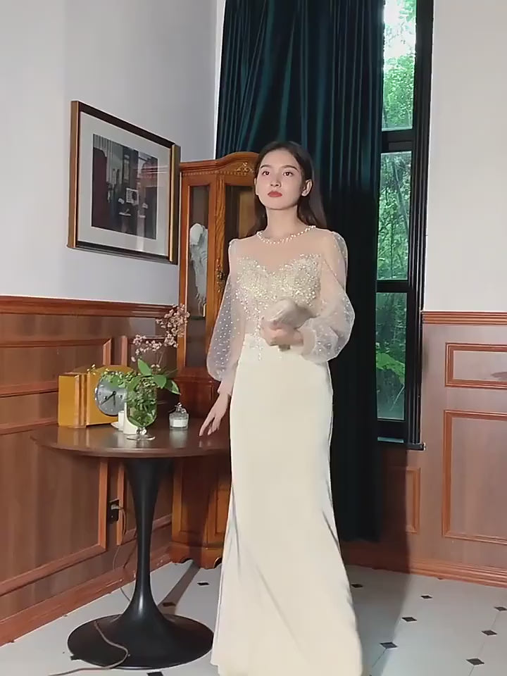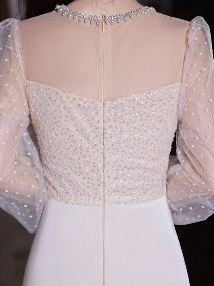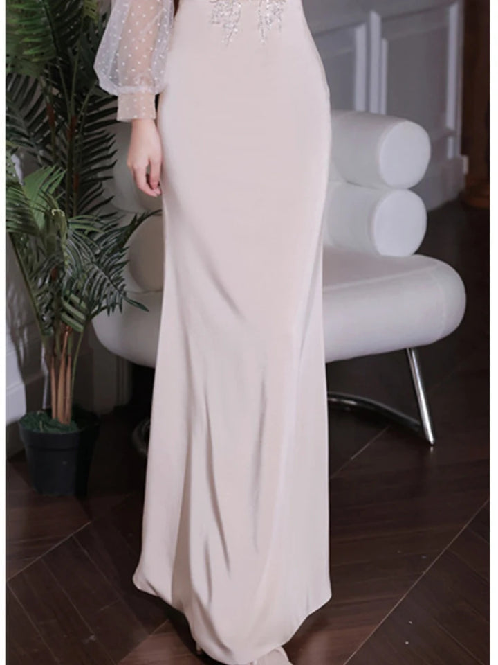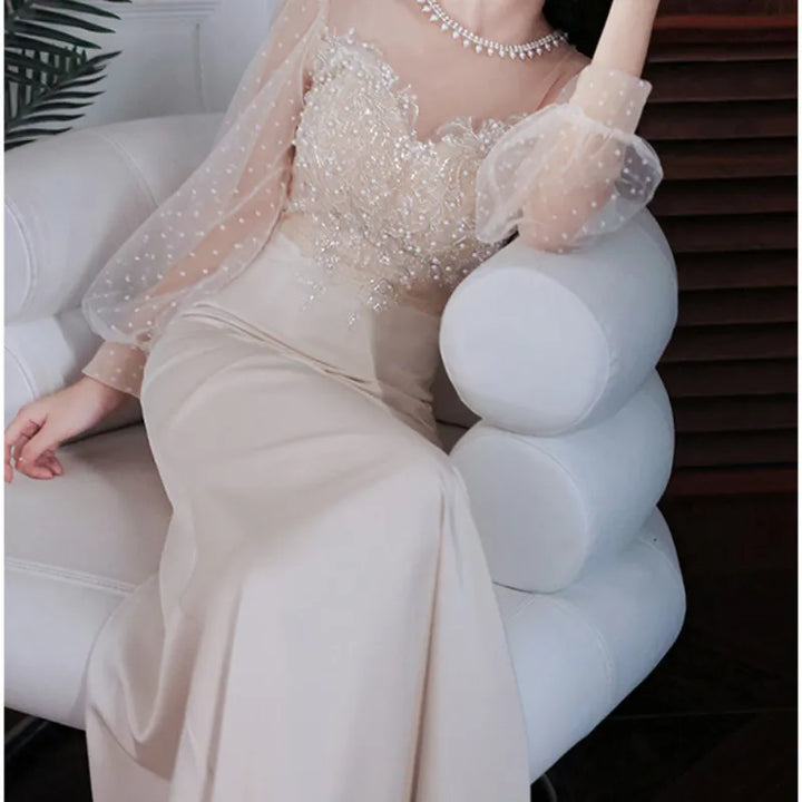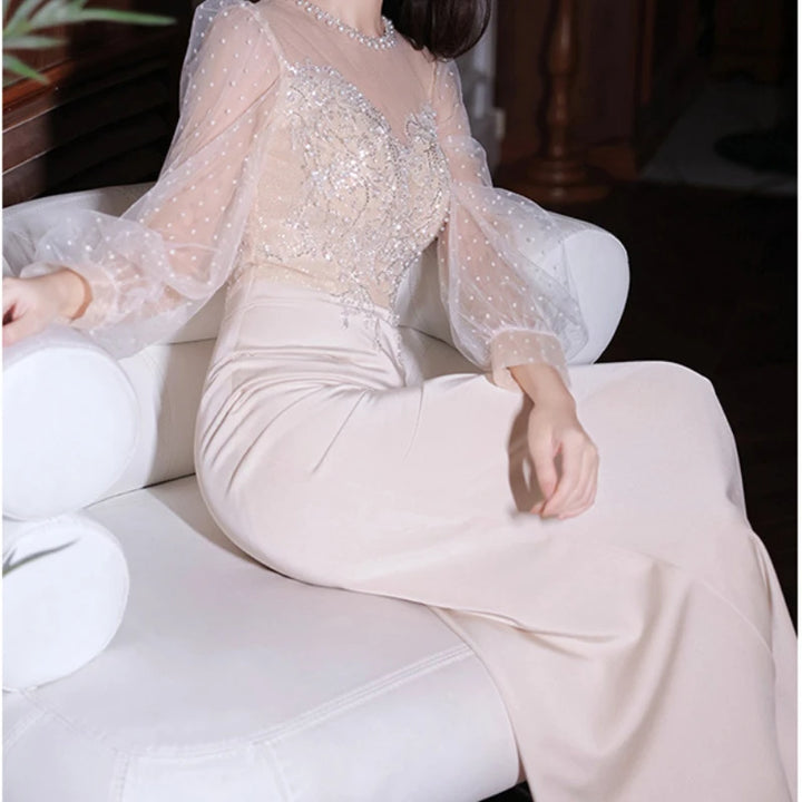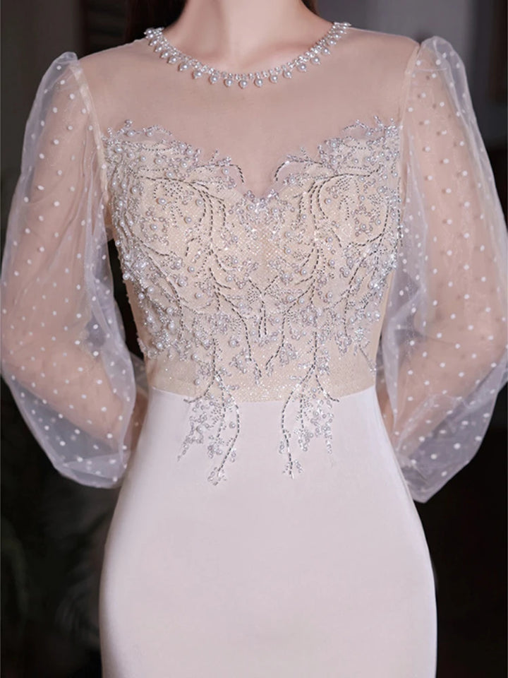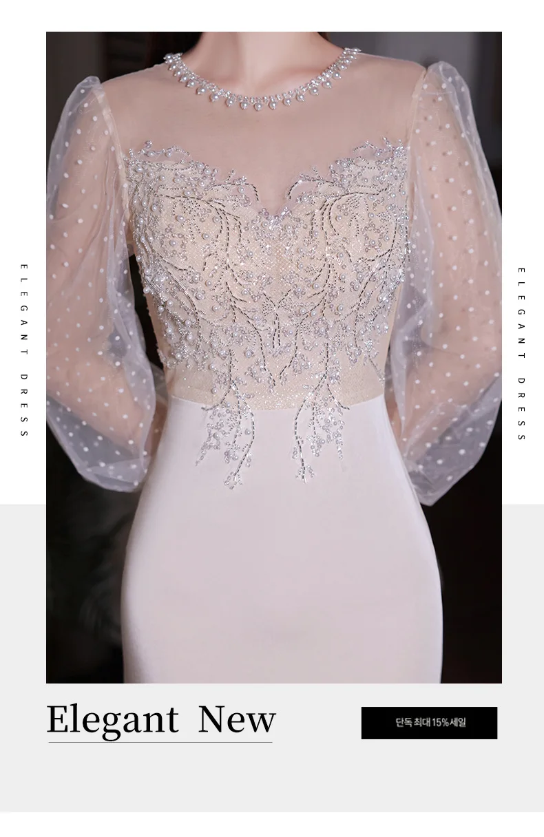 Temperament Elegant Appliques O-neck Beading Evening Dress Full Sleeve Mesh Patchwork Wedding Party Vestidos Slim Prom Dresses