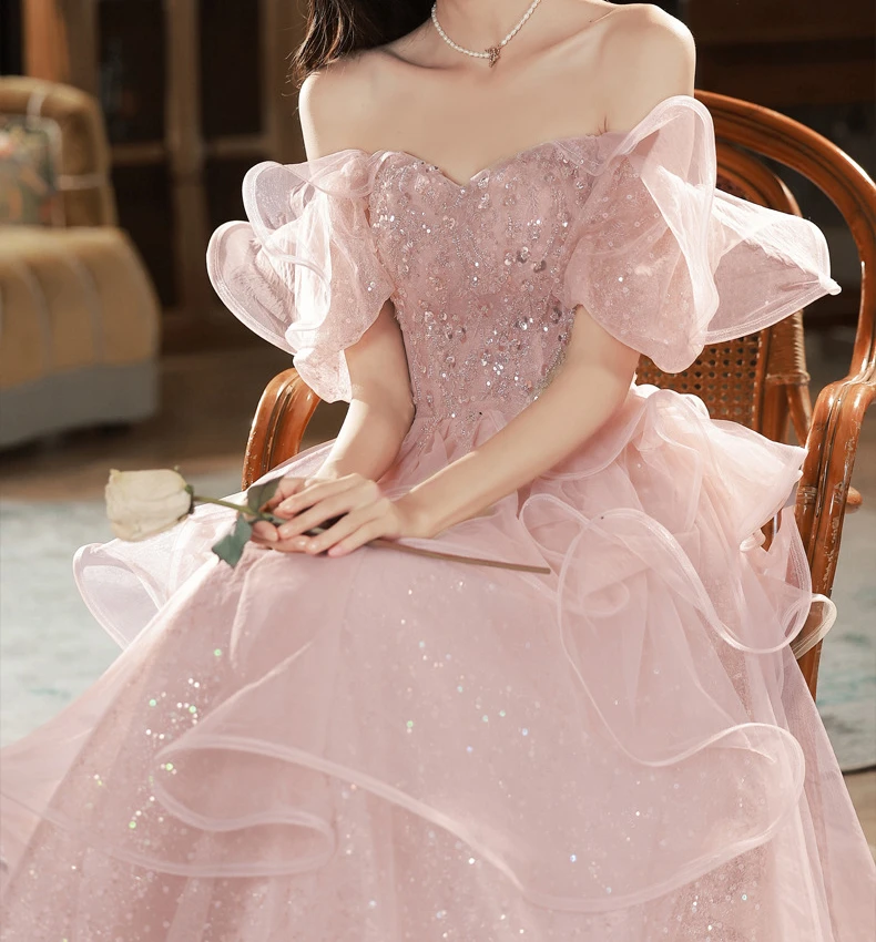 French Sweet Sequined Slim Waist Evening Dresses 2024 New Flower Sleeve Formal Dress Tiered Ruched Women Wedding Party Dress