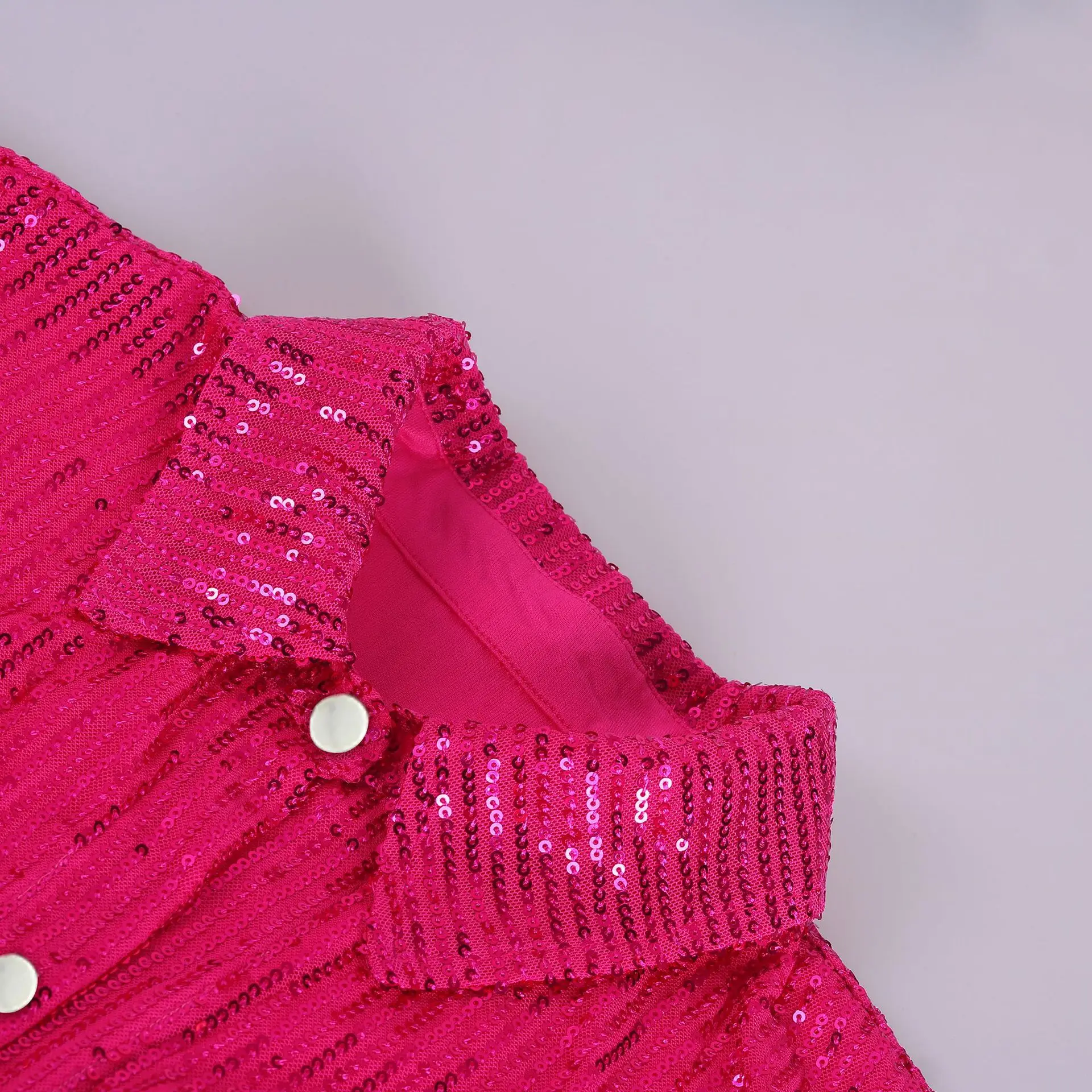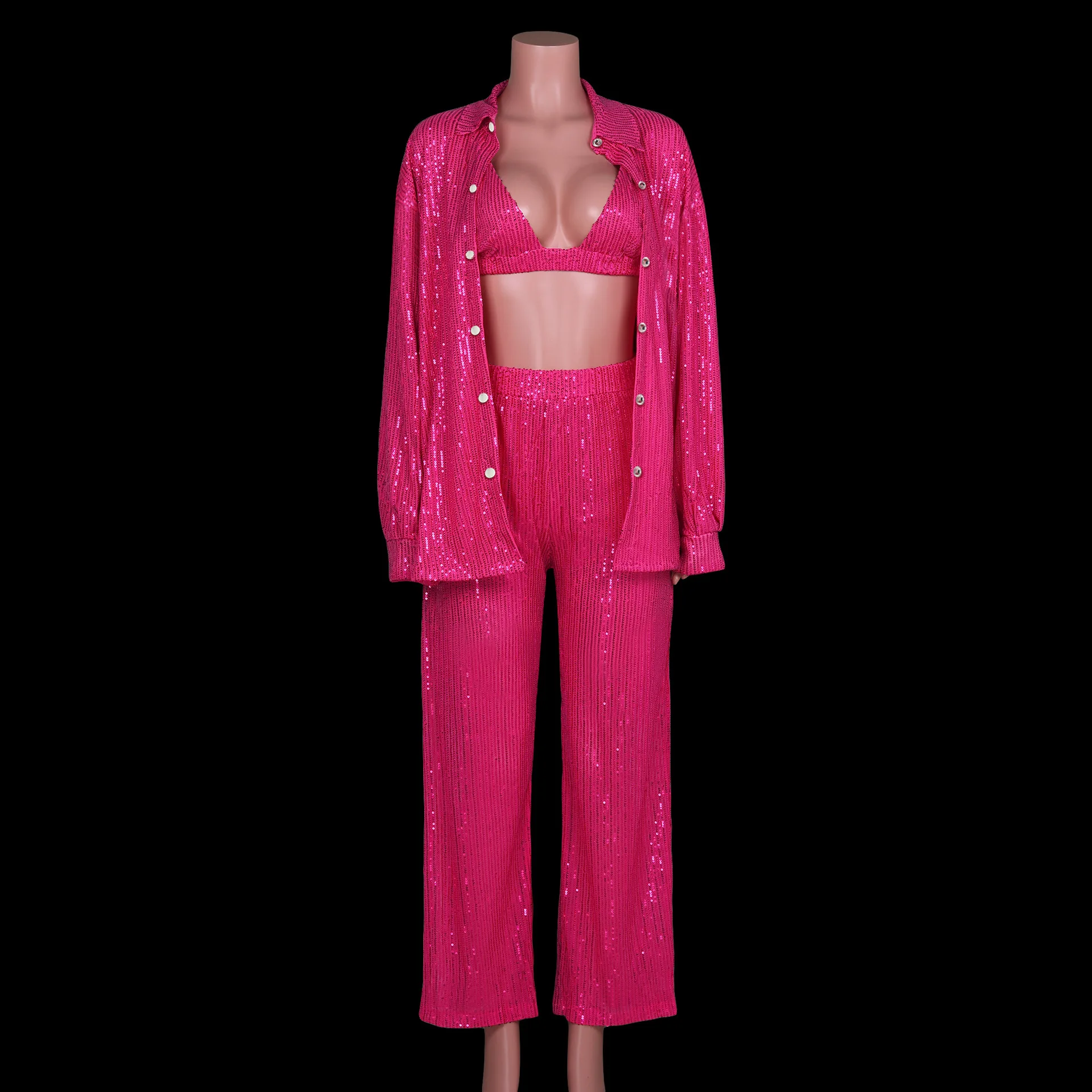 Sequins Glitter Sparkling Disco Costumes Pink Long Sleeve Shirts With Flare Trousers