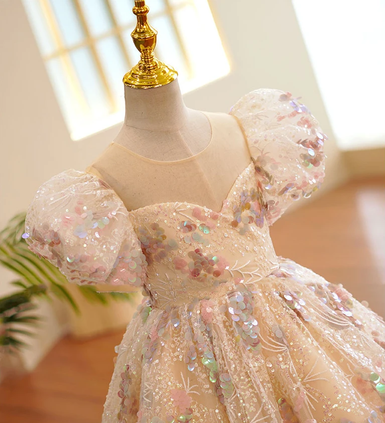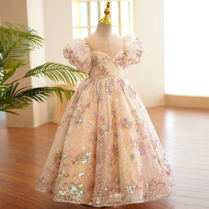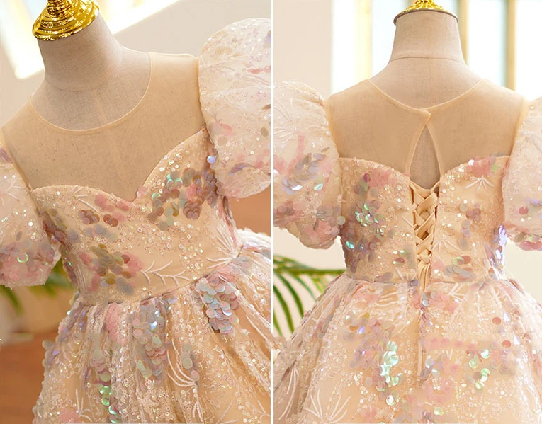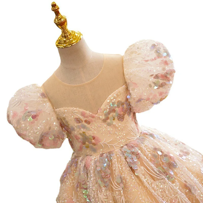Sequined Embroidery Girls Birthday Gowns Cross Lace Up Puff Sleeve Flower Girl Dress Kids Princess Junior Bridesmaid Dresses