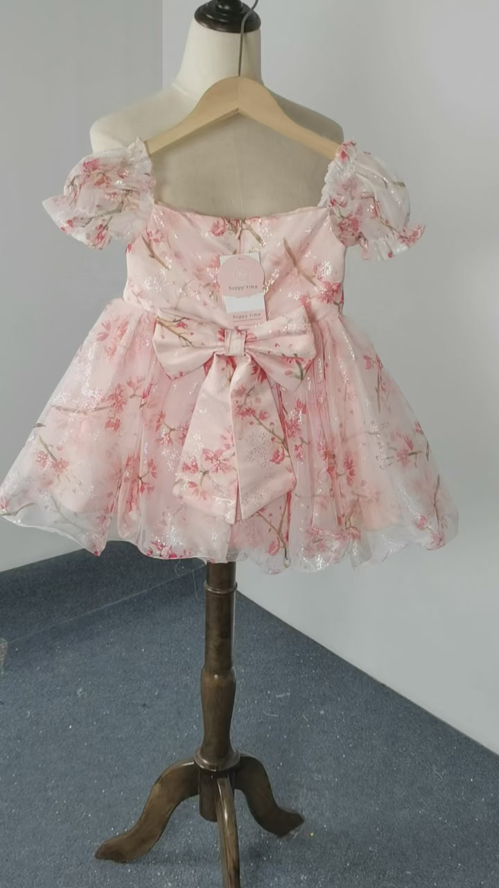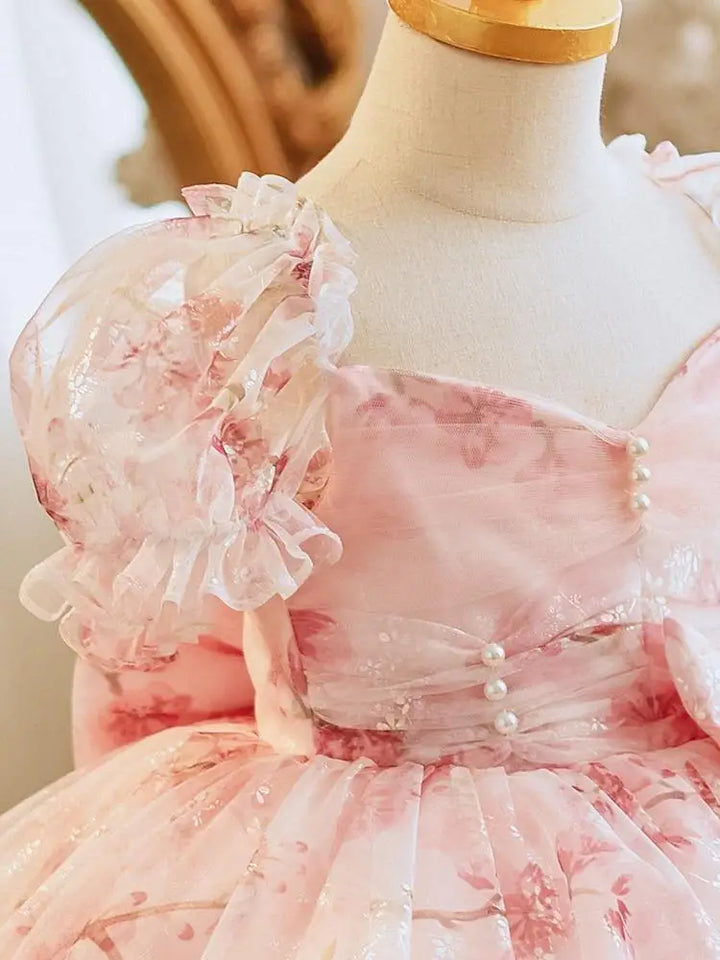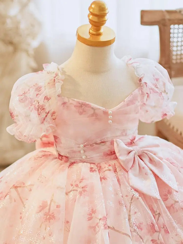 Square Collar Mesh Tiered Kids Birthday Party Dress Flower Printed Bow Ball Gown Princess Robe Puff Sleeve Flower Girls Dresses