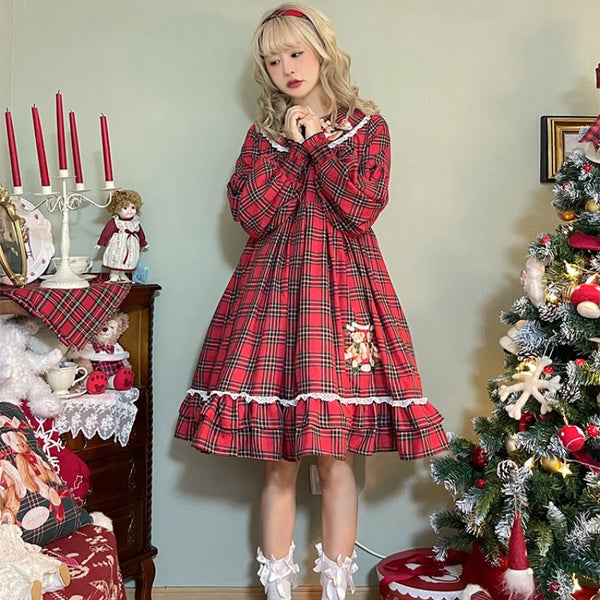 Japanese Kawaii Christmas Lolita Dress Women Sweet Peter Pan Collar Lace Plaid Princess Dresses Girl High Waist Slim Party Dress