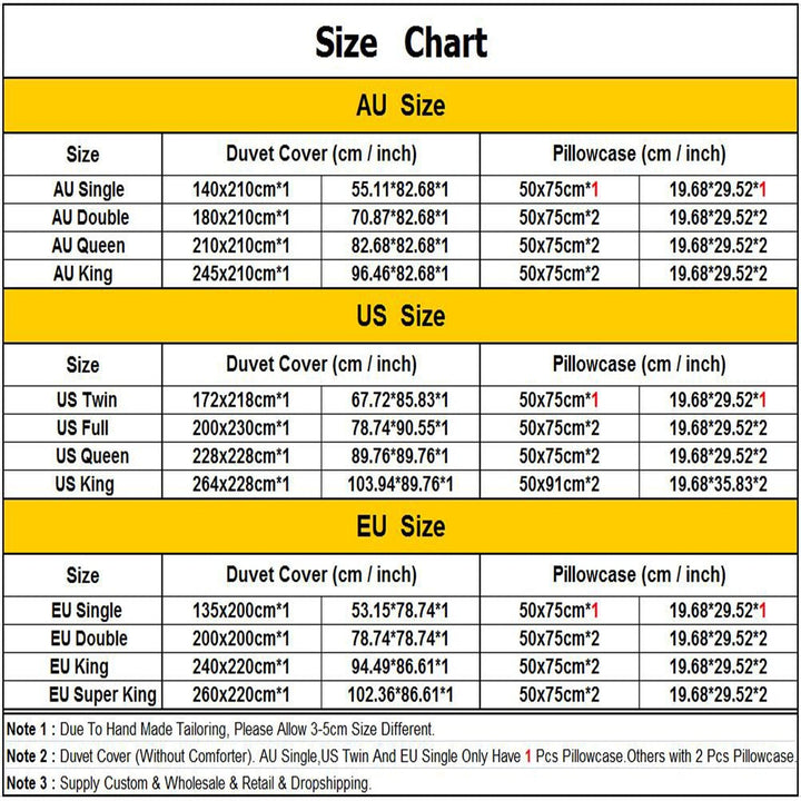 •  (AU Single,US Twin And EU Single Is Duvet Cover*1 + Pillowcase*1=2pcs)