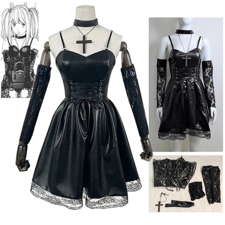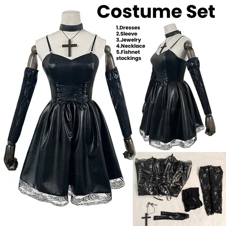 Misa Amane Cosplay Costume Death Note Leather Sexy Dress Outfit with Neck Jewelry Stockings Necklace Uniform Halloween Costume