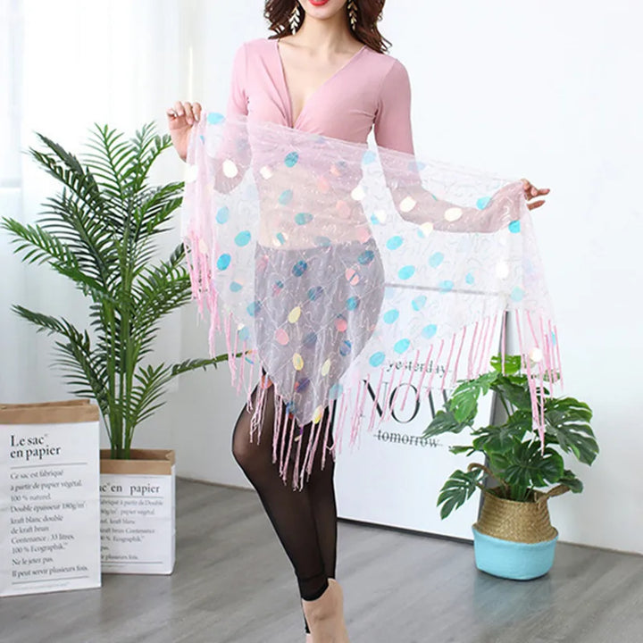 This truly one size glamorous mesh hip scarf with all the shiny round sequins, you will look good. Great for any style of Belly Dance, Zumba fitness class, and more. Mesh base with intricate sequins fringe sewn on triangular belt.