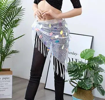2019 New Belly Dance Clothes Accessories Mesh Long Tassel Triangle Belt Hand Crochet Bellydance Hip Scarf with Round Sequins