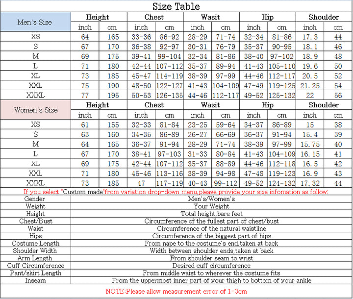 As all of our costume is hand-sewn, the finished costume may vary by approximately one (1-2) inch in either direction of the specified measurements.