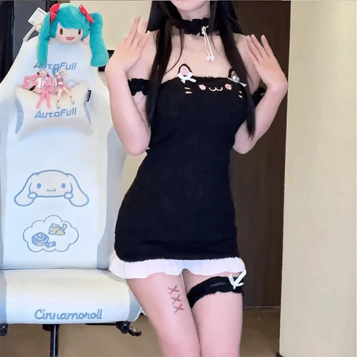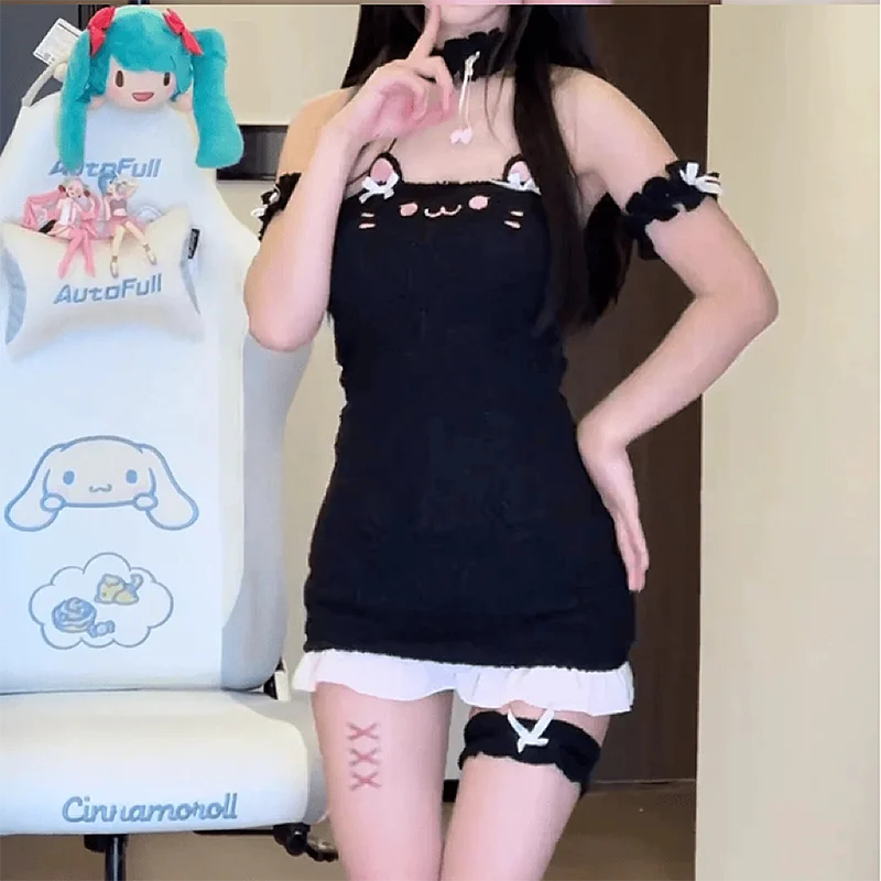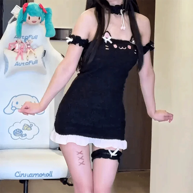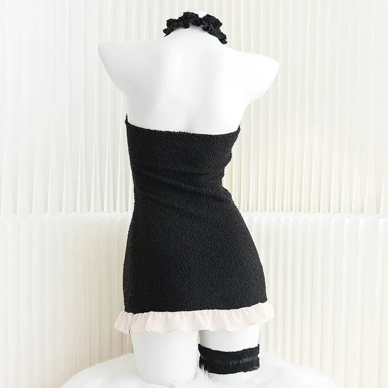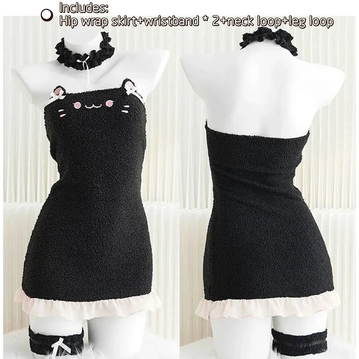Cat Cute Plush Dress Unifrom Cat Girl Mini Dress Black Nightdress Role Play Backless Underwear Anime Outfit Maid Bow Set