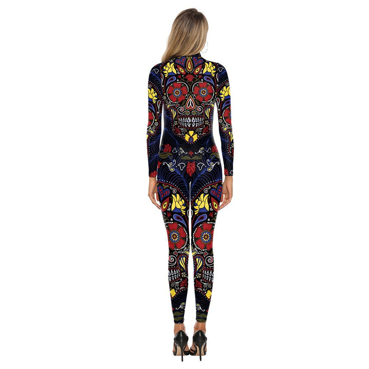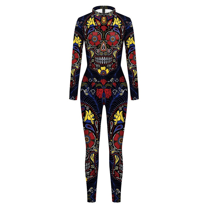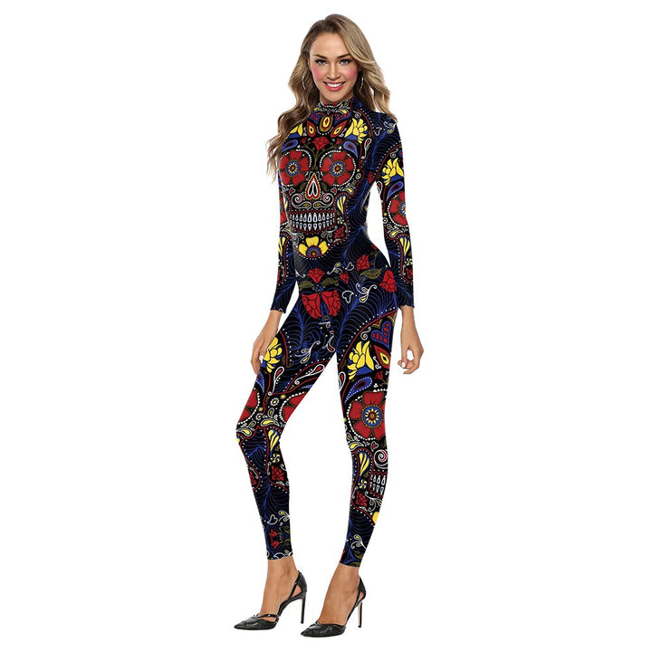 Fashion Skull Print Women Jumpsuits Adult Elastic One-Piece Costumes Sexy Tight Bodysuits Long Sleeve Cosplay Halloween Jumpsuit