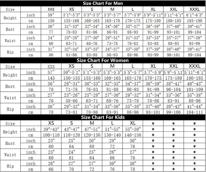Different size chart for different gender, so please kindly leave us a note of your gender (Man, Woman, Kid) when you choose the size. (E.g. Kid XL)