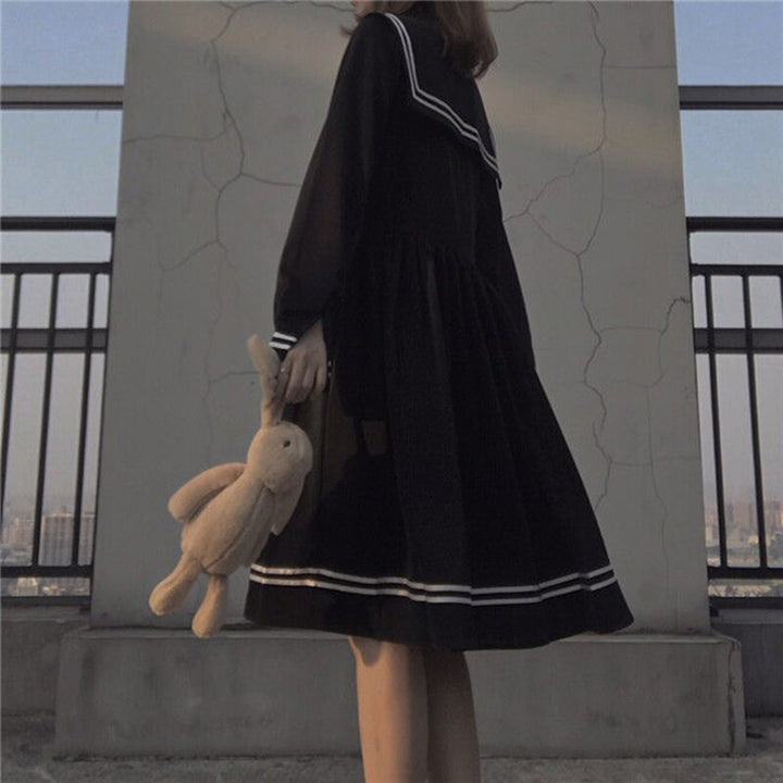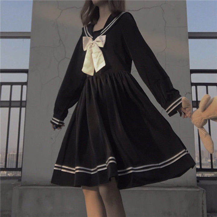 Japanese Lolita Dress Kawaii Sweet Bowknot Robes Long-Sleeve Black Knee-Length Navy Dress Preppy Party Women Dress Summer