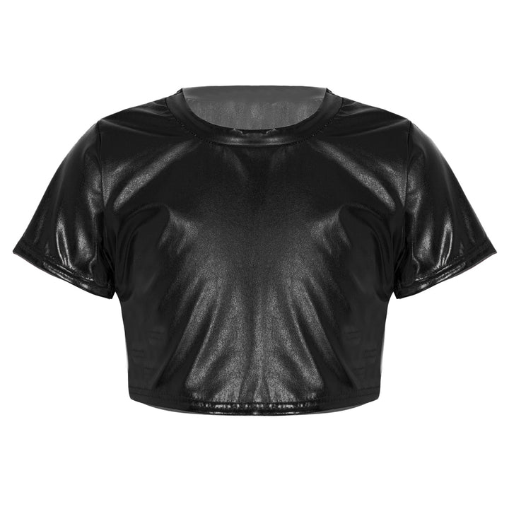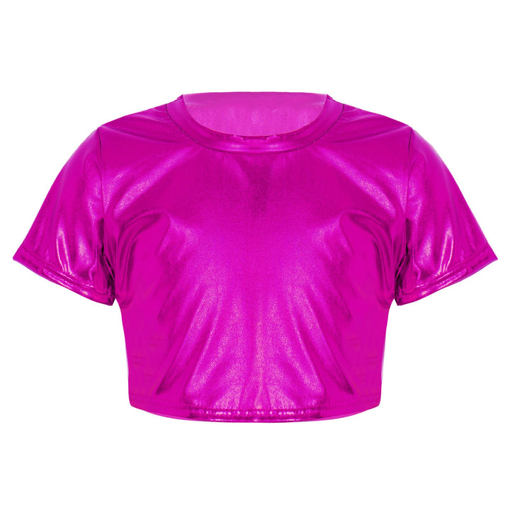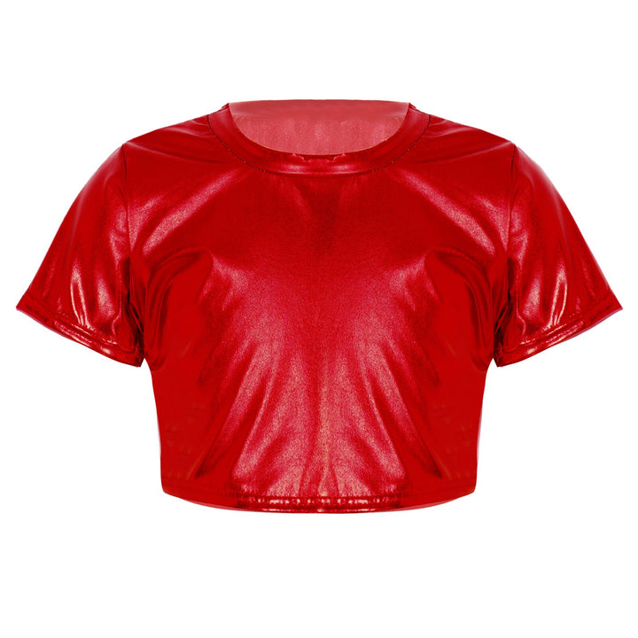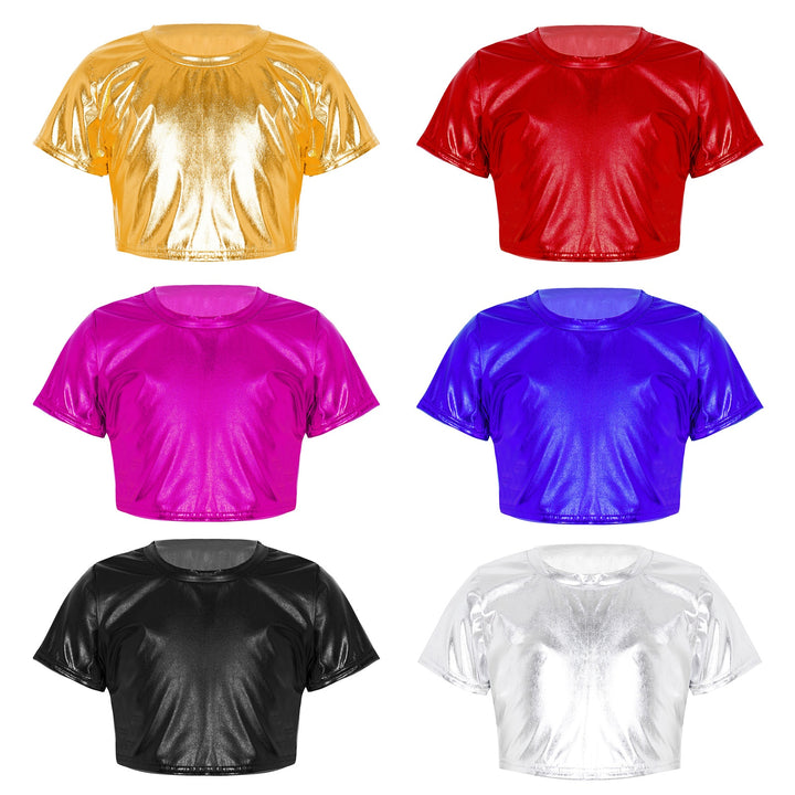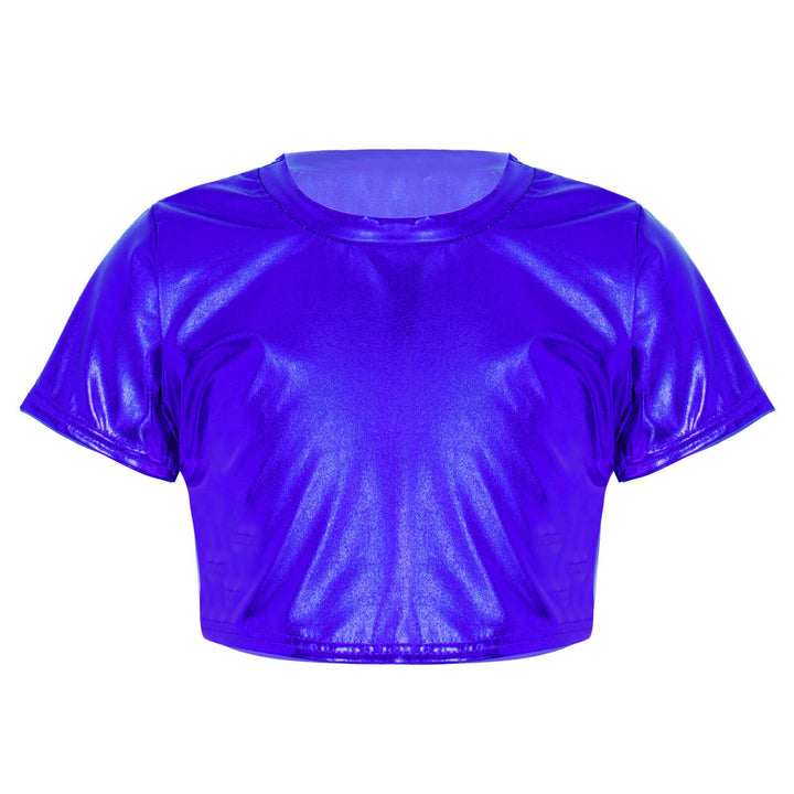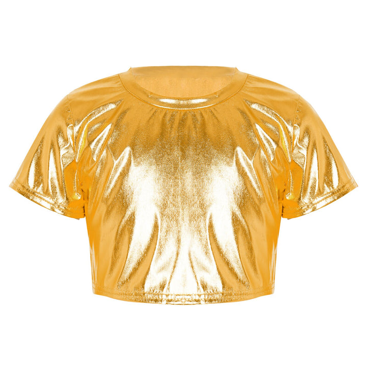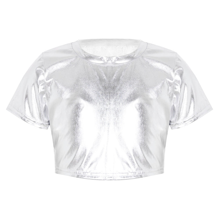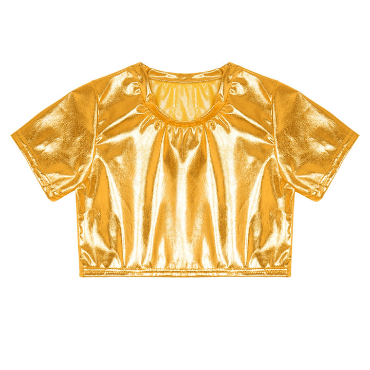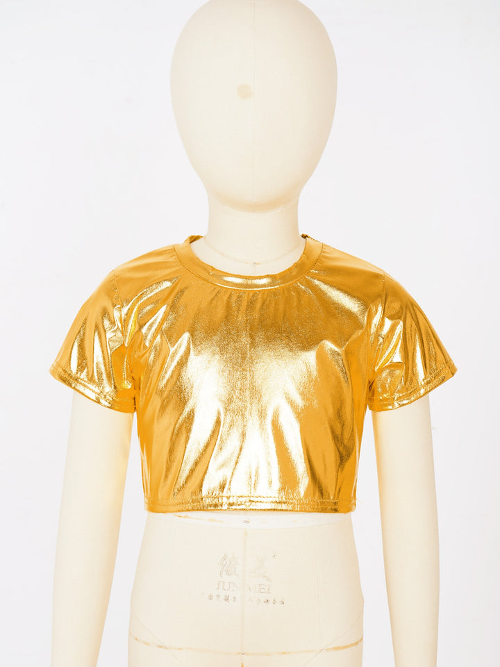 Kids Unisex Modern Dance Performance Top Short Sleeve Shiny Metallic Crop Top.