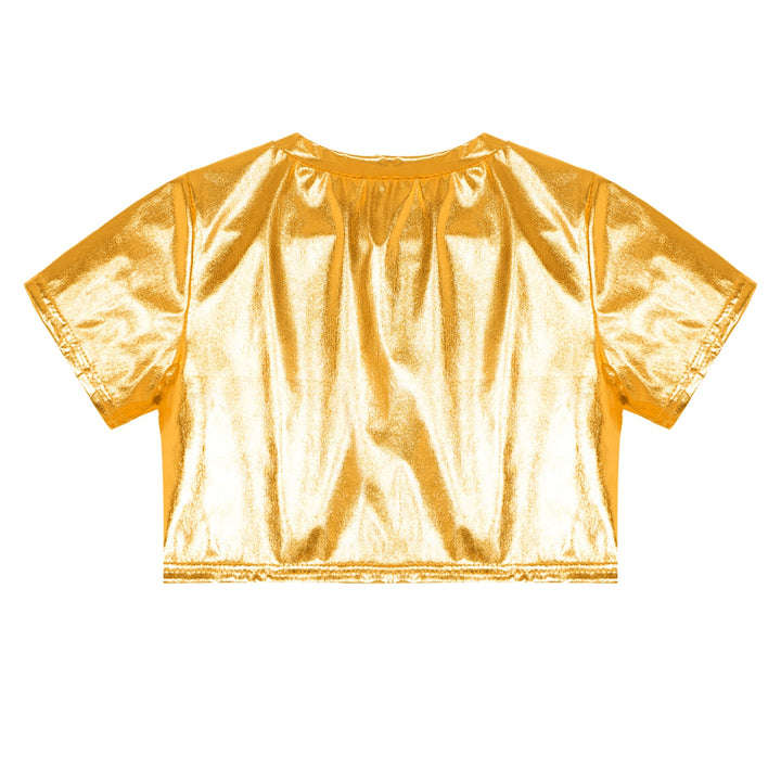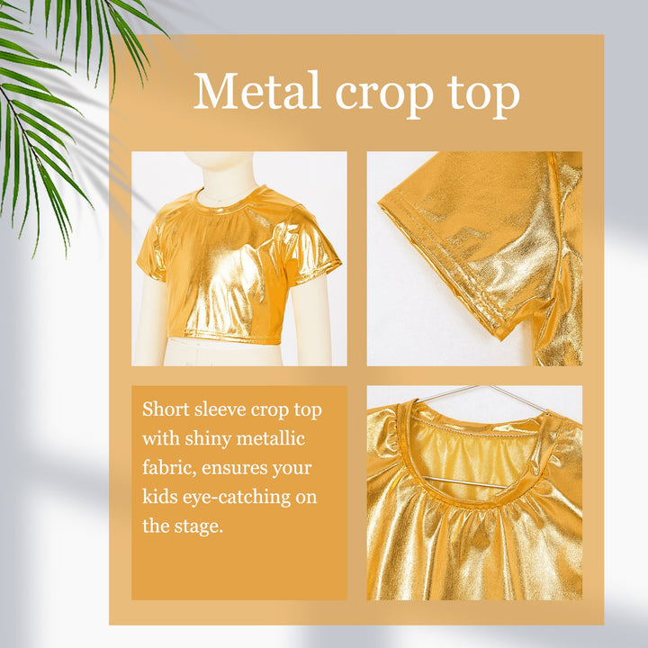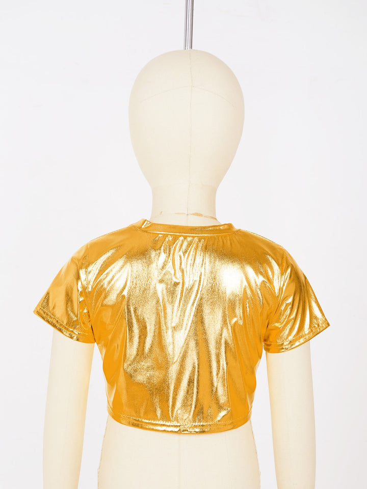 Short sleeve crop top with shiny metallic fabric, ensures your kids eye-catching on the stage.