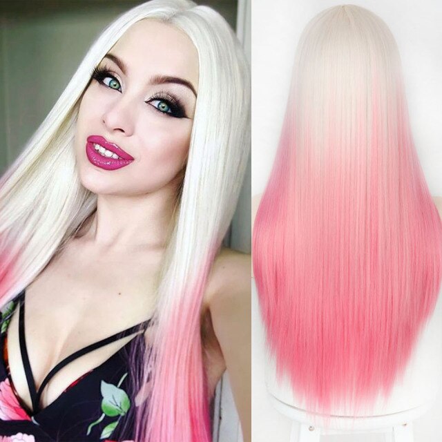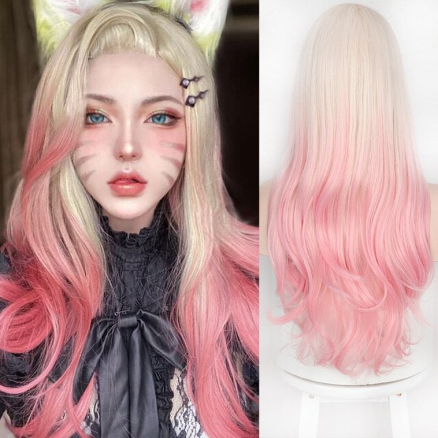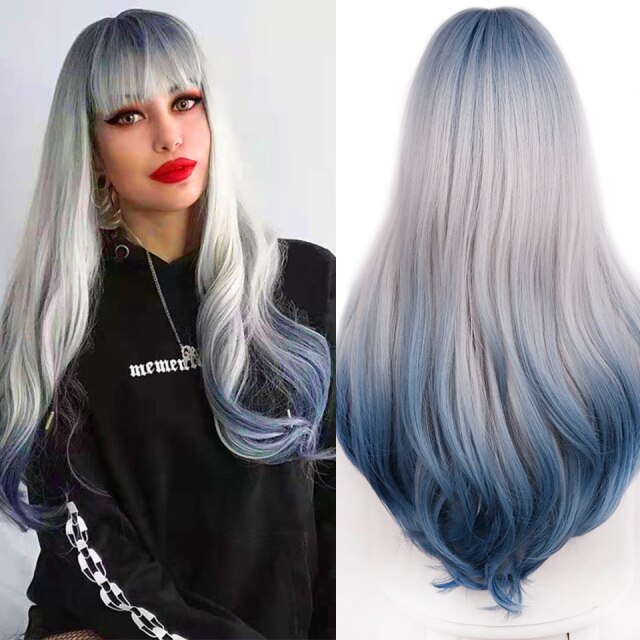 Long Ombre Blue Off-white Synthetic Wigs with Bangs Natural Wave Pinup Wig for Women Cosplay Party Heat Resistant Fiber