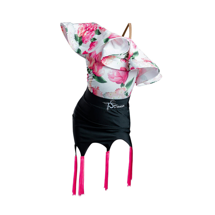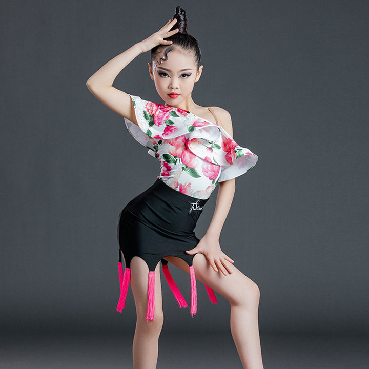 Lotus Leaf Sleeve Latin Dance Dress Suit Girls Fringed Dress Slit Suit Child Latin Dance Dresses Kids Practice Cloth SL4847