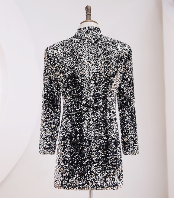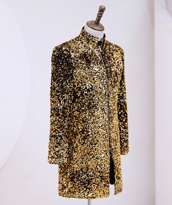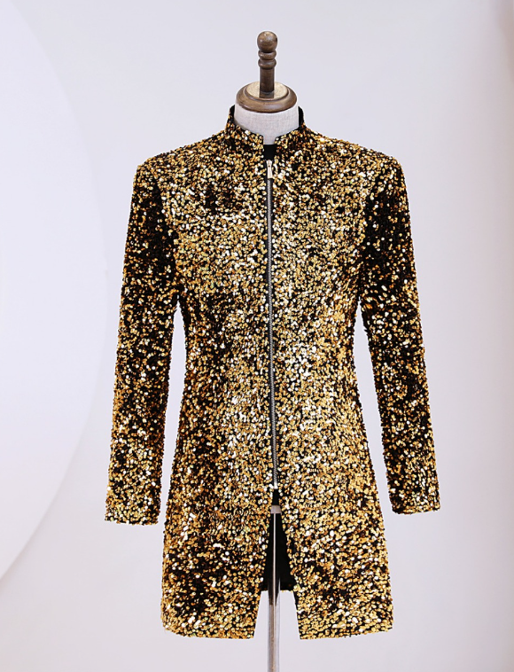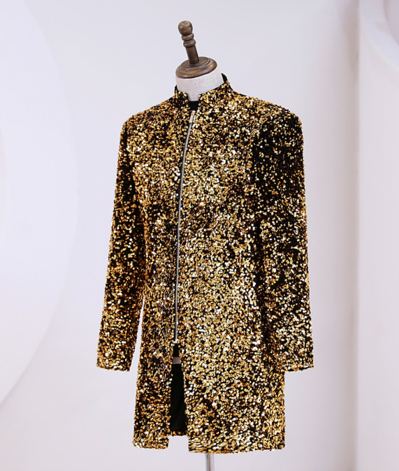 Men's gold velvet sequin stand-up collar medium and long style performance suit casual jacket male singer banquet show