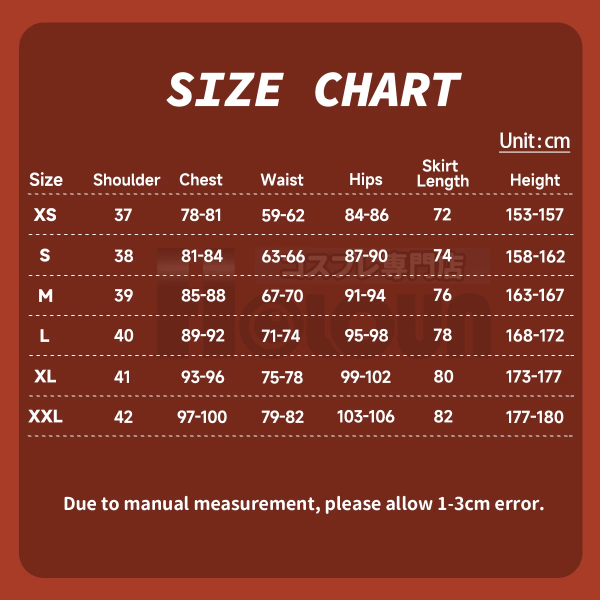 As all of our costume is hand-sewn, the finished costume may vary by approximately one (1-2) inch in either direction of the specified measurements.