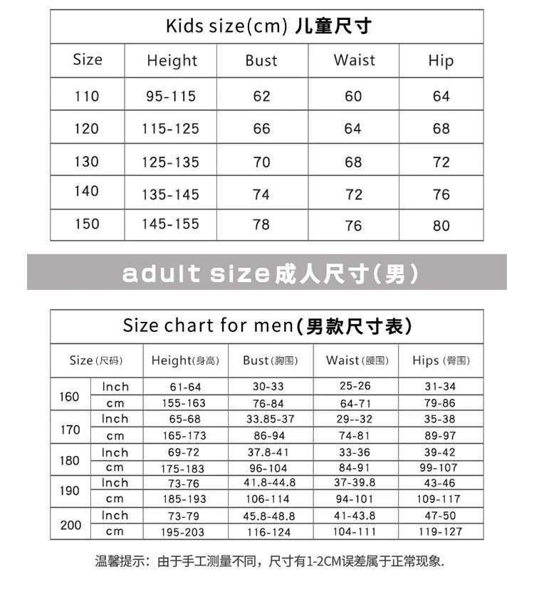 All our costumes are hand-sewn, so the finished product may vary by approximately 1–2 inches from the listed measurements.