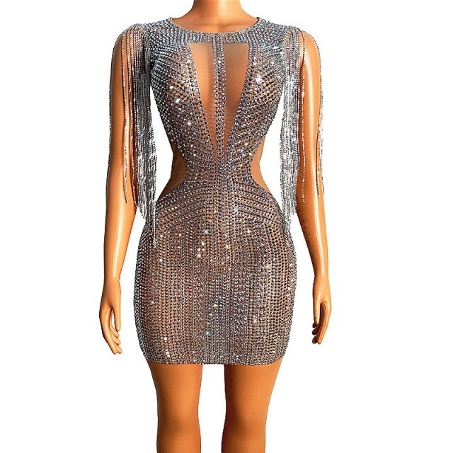 Sparkly Silver Rhinestone Fringe Transparent Short Dress Birthday Celebrate Chain Shoulder Outfit Women Dancer Evening Dress