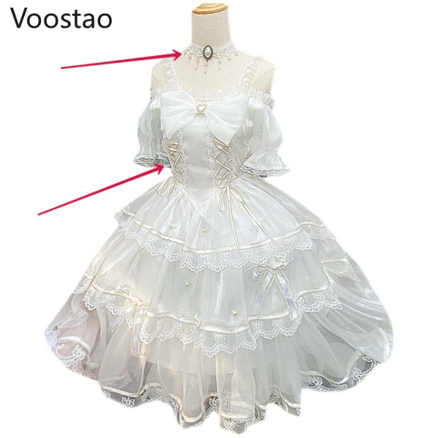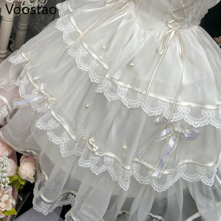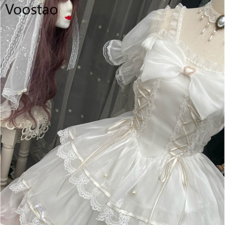 Sweet Lolita Princess Dress Women Cute White Bowknot Lace Ruffles Flowers Wedding Dresses Girly Kawaii Tulle Party Fairy Dress