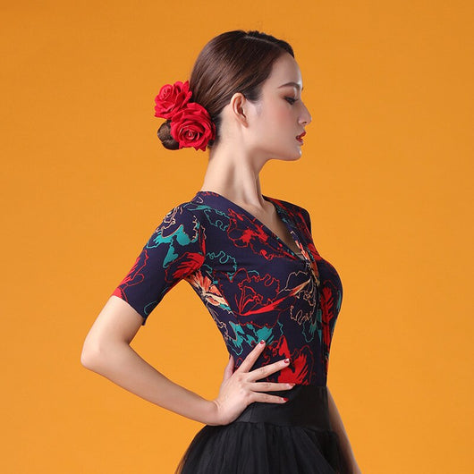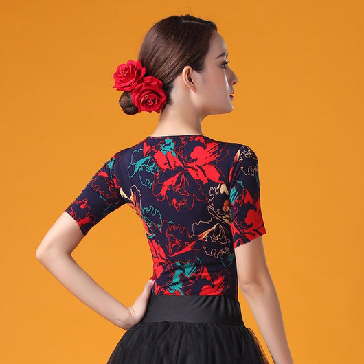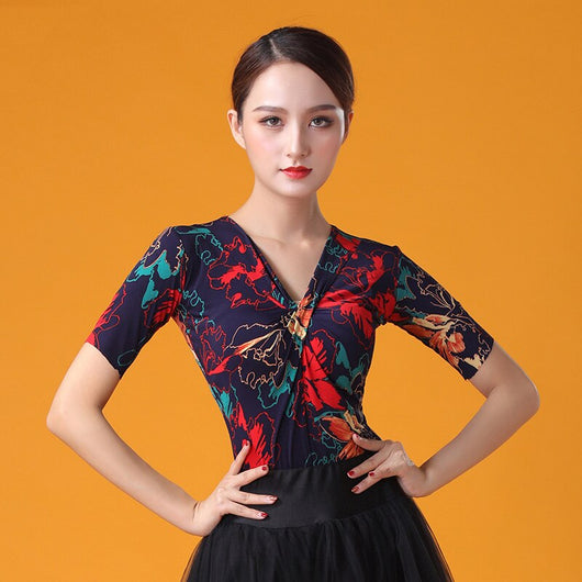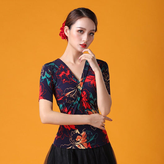Women's Sexy V-Neck Printing Shorts Sleeve Ballroom Latin Dance Tops For Samba Rumba Training/Performance Dancing Clothes DL5893